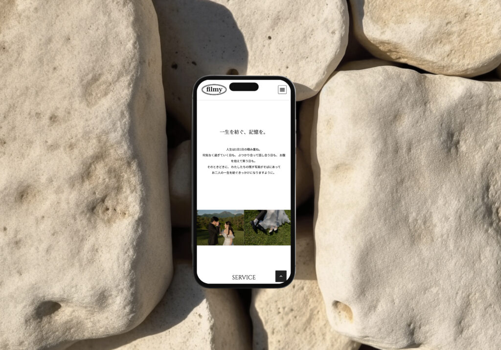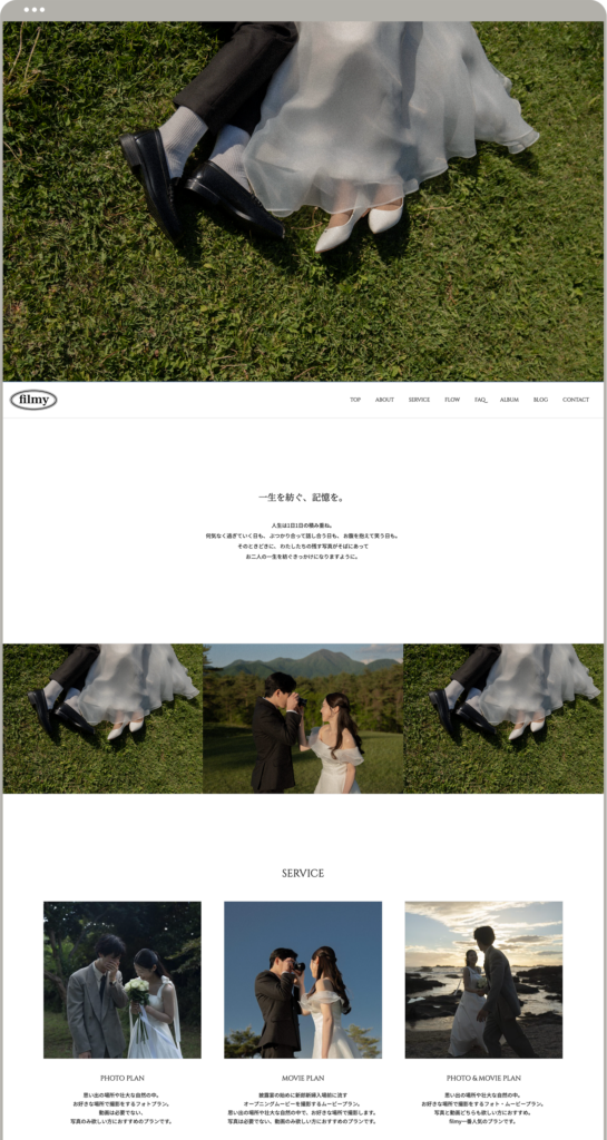 Word Pressでカスタムデザインサイトを制作しました。フォトグラファーさんのサイトなので、写真が映えるように白ベースのデザインに仕上げました。サービスやコンセプトも分かりやすくまとめ、ただ写真を並べただけのサイトではなく、ブランドサイトのように仕上げました。