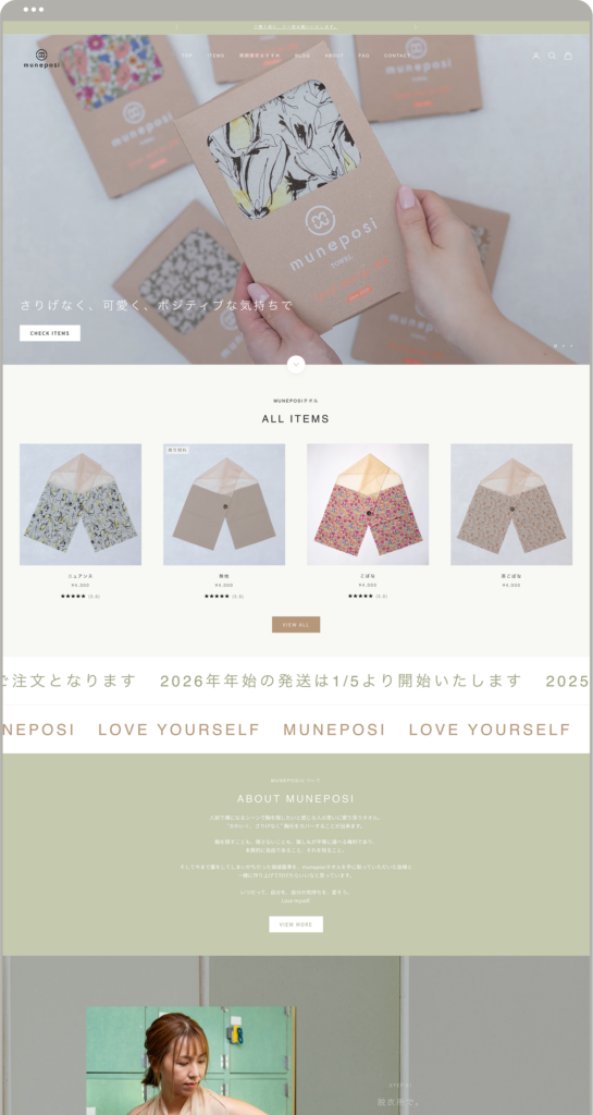Shopifyを使用して、ECサイト制作を担当しました。商品を載せるのみのサイトではなく、ブランドの良さが伝わるように、ブランドサイトのように仕上げました。