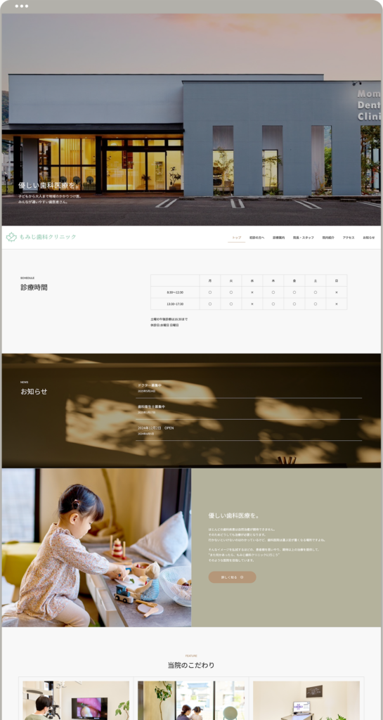 Word Pressでカスタムデザインサイトを制作しました。もみじ歯科さんの温かい雰囲気がサイトでも伝わるように、意識して制作をしました。